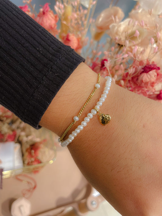 PULSERA PERLA Y DIJE CORAZÓN ORO MARTILLADO